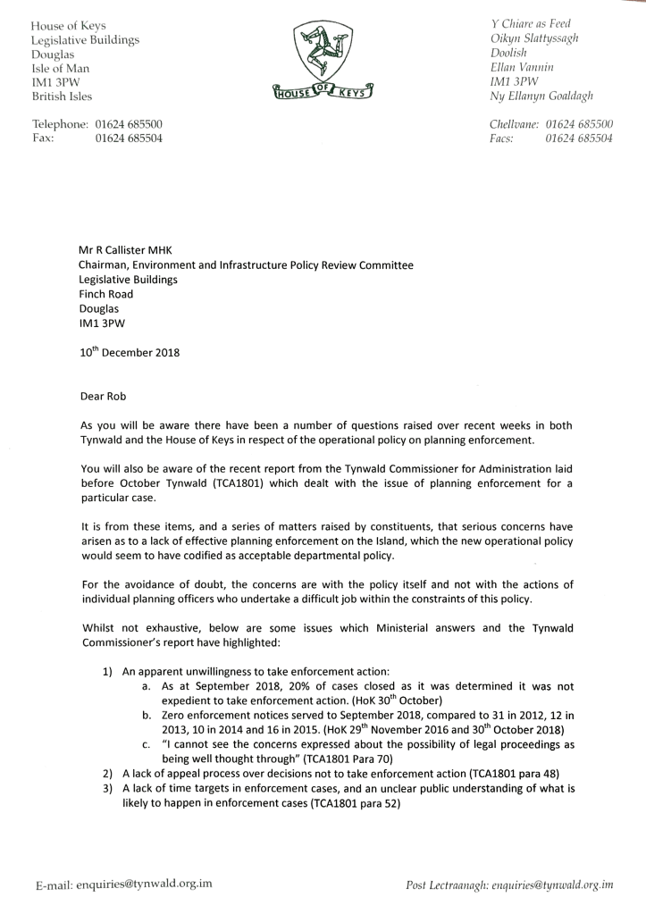 For some time I have had serious concerns about the way that Planning Law is enforced on the Isle of Man and since December 2016 I have tabled 10 separate Tynwald and Keys questions about planning enforcement, as well as a few about specific planning enforcement failures.