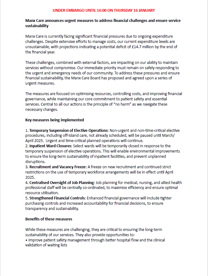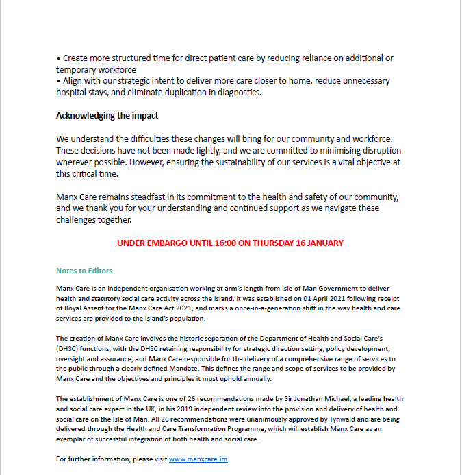 Perhaps because I am asking these questions, a press release that was apparently sent out to the media on January 15th has fallen into my possession – a week before the statements were made by the Minister to Tynwald about there being “no cuts”. This press release was embargoed, and it would appear it remains so, which is why it wont have been reported on by any of our media outlets.